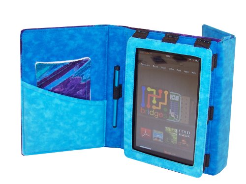 Have more fun using your Kindle Fire! This high quality cover is designed and hand-crafted right here in the United States, where "quality first" and "built to last" still matter! Specifically designed to fit the Kindle Fire, Fashion Tec covers are individually hand-constructed using colorful 100% printed cotton fabric and lightweight protective padding to keep your Kindle Fire safe, snug and secure. This lightweight cover is designed with a heavy-duty strap that wraps around the case to keep the cover closed and your Kindle Fire safe while you're transporting it in a bag, briefcase or purse. No harmful magnets are used in the construction; instead we've chosen heavy-duty hook and loop closures to keep the cover securely closed. The design of this cover features coordinating fabrics in cool water tones of aqua, blue and turquoise, with accents of purple and violet.